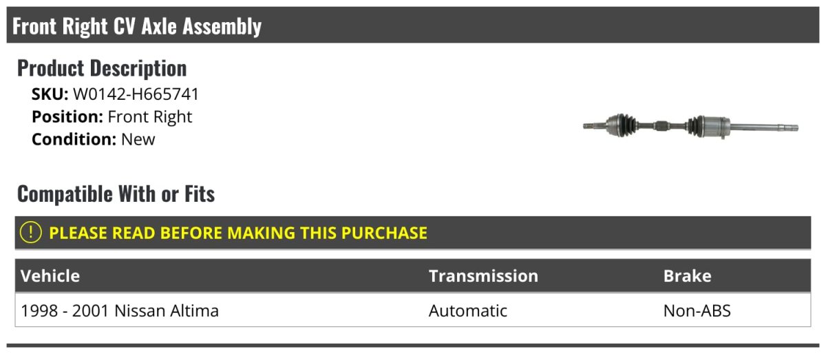 - Front Right Passenger Side Cv Axle Assembly For 1998-2001 Nissan Altima Automatic Transmission With Non-abs