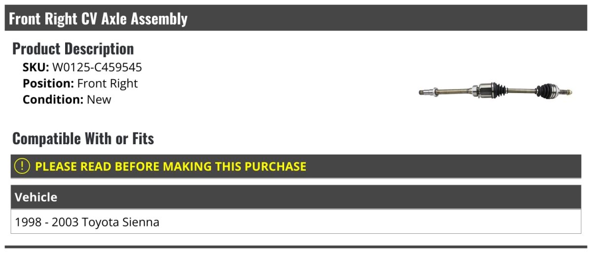Compatible with or fits: 1998 - 2003 Toyota Sienna. (1) Front Right Passenger Side CV Axle Assembly. Review Description to Ensure Proper Fit. Direct Fit. OE Quality.