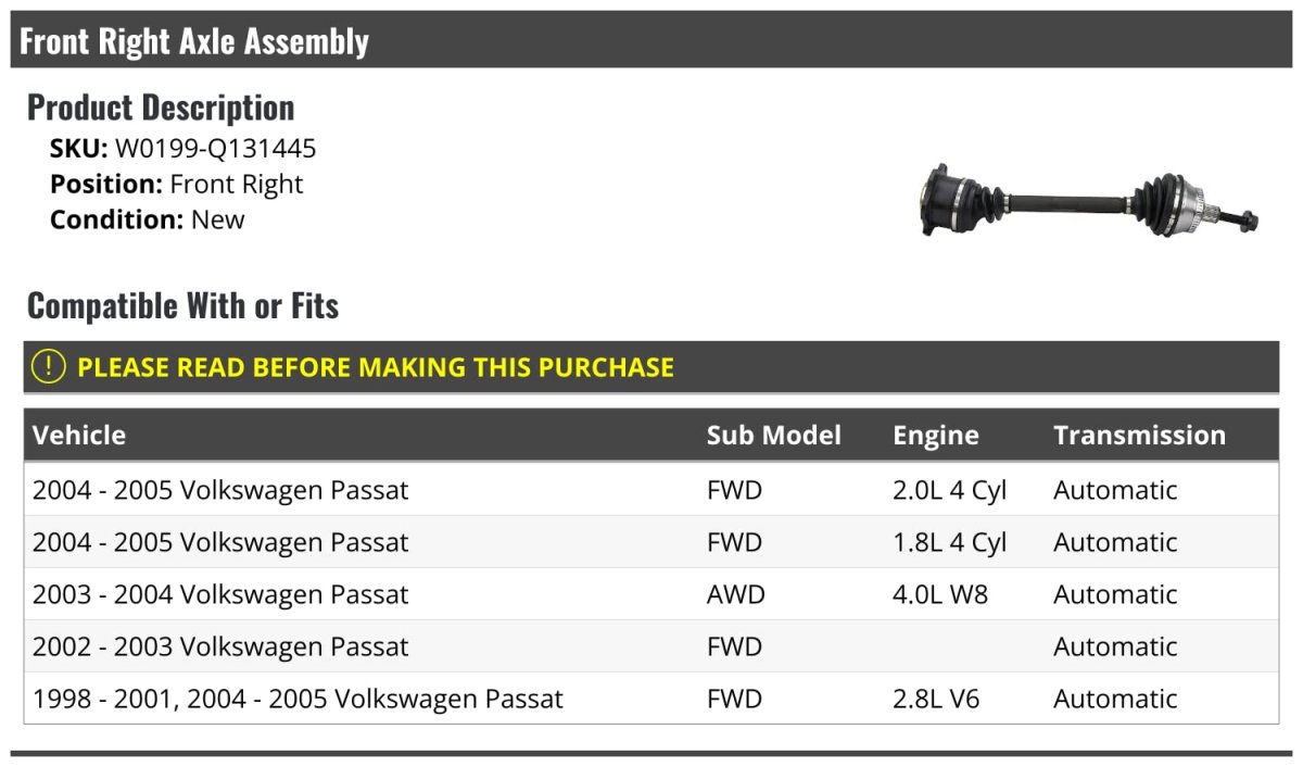 - Front Right Passenger Side Cv Axle Assembly For 1998-2005 Volkswagen Passat Automatic Transmission