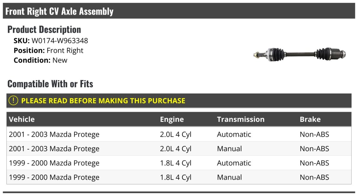 - Front Right Passenger Side Cv Axle Assembly For 1999-2003 Mazda Protege