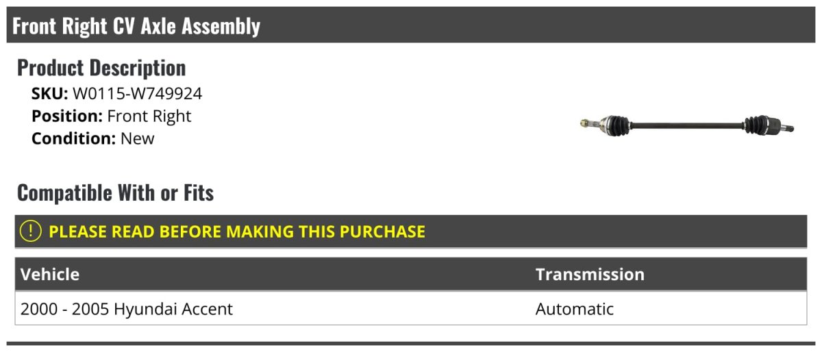 - Front Right Passenger Side Cv Axle Assembly For 2000-2005 Hyundai Accent Automatic Transmission