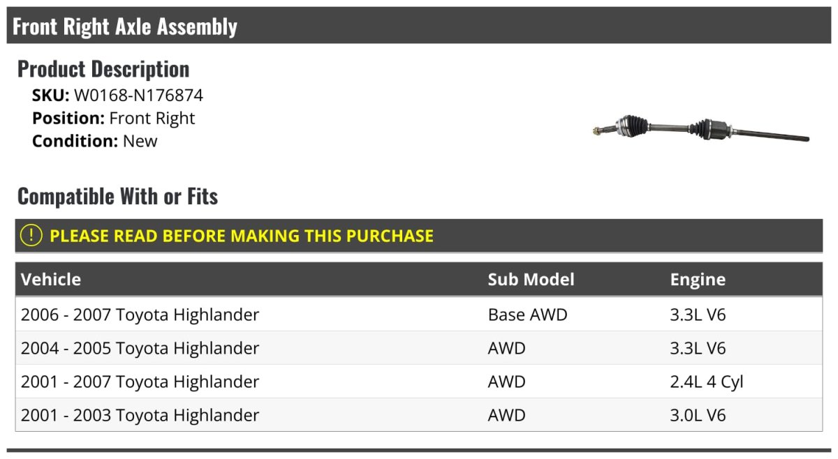 Compatible with or fits: 2006 - 2007 Toyota Highlander Base AWD 3.3L V6. Compatible with or fits: 2004 - 2005 Toyota Highlander AWD 3.3L V6. Compatible with or fits: 2001 - 2007 Toyota Highlander AWD 2.4L 4 Cyl. Compatible with or fits: 2001 - 2003 Toyota Highlander AWD 3.0L V6. Review Description to Ensure Proper Fit.Other fine products
