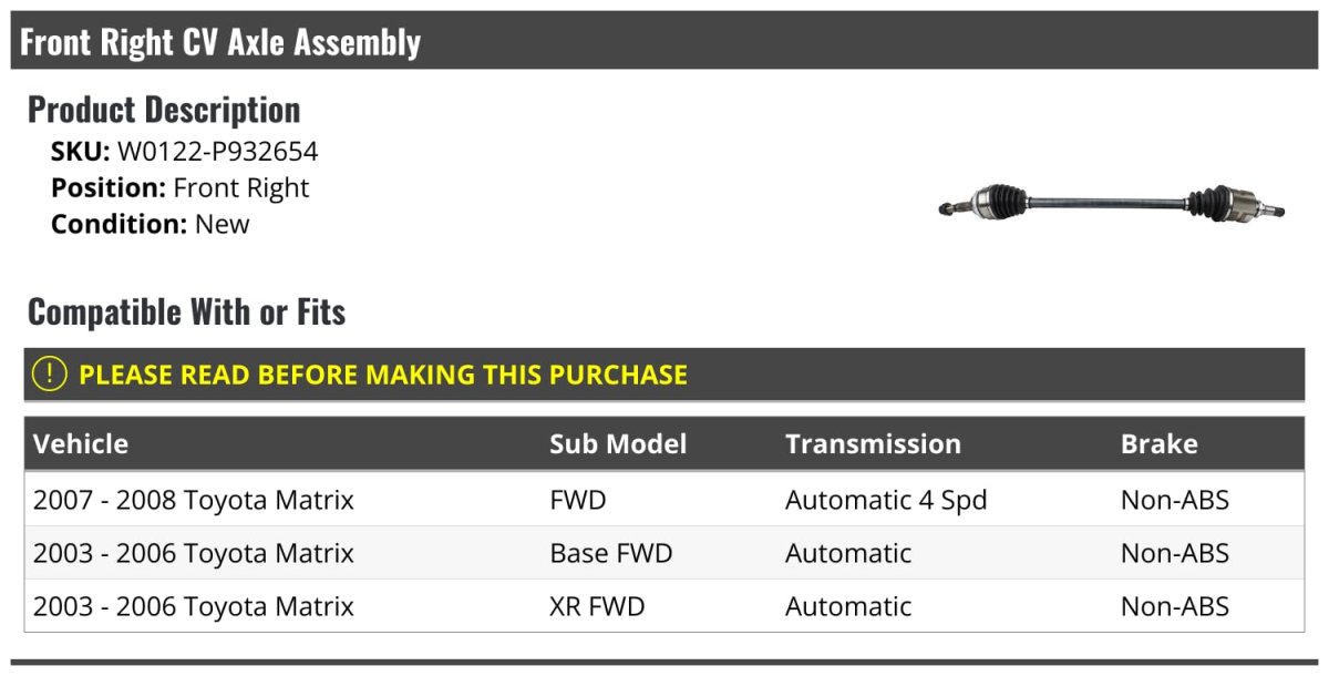 - Front Right Passenger Side Cv Axle Assembly For 2003-2008 Toyota Matrix Automatic Transmission