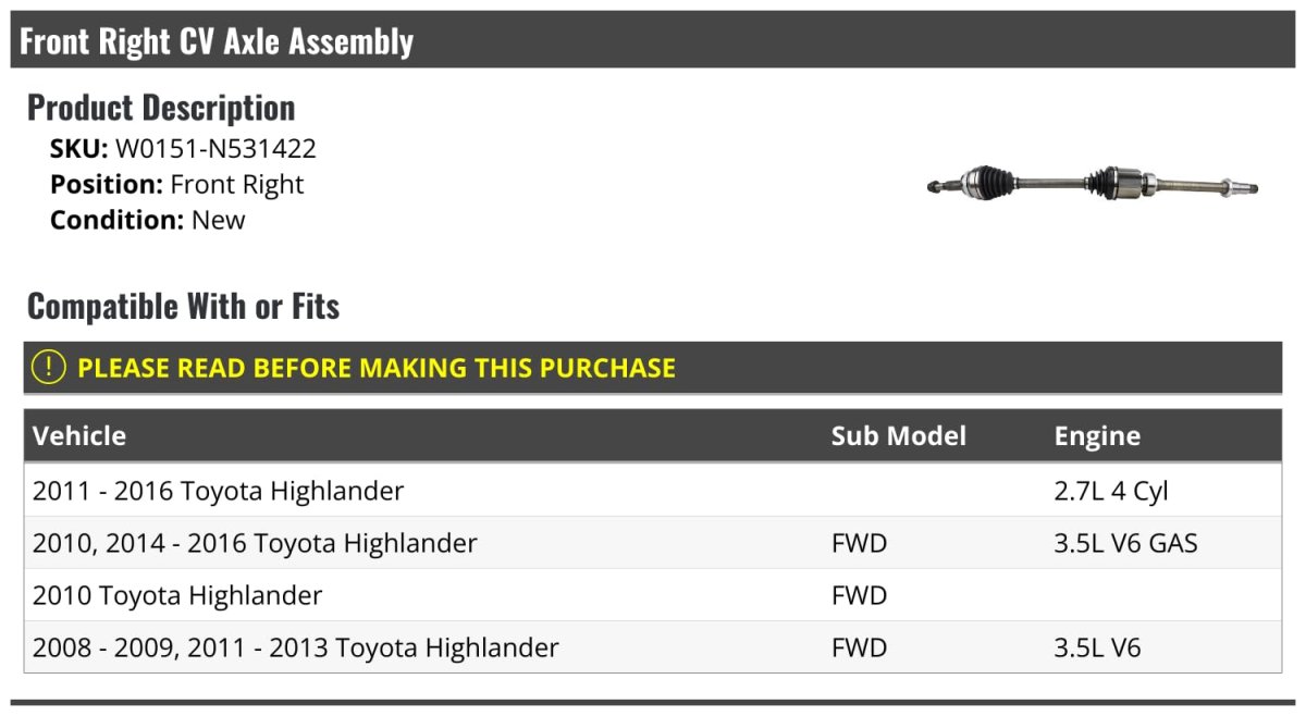 Compatible with or fits: 2011 - 2016 Toyota Highlander 2.7L 4 Cyl. Compatible with or fits: 2010, 2014 - 2016 Toyota Highlander FWD 3.5L V6 GAS. Compatible with or fits: 2010 Toyota Highlander FWD. Compatible with or fits: 2008 - 2009, 2011 - 2013 Toyota Highlander FWD 3.5L V6. Review Description to Ensure Proper Fit.Other fine products