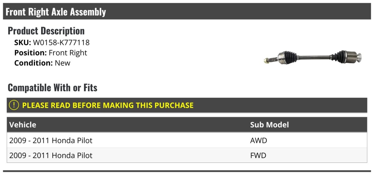 - Front Right Passenger Side Cv Axle Assembly For 2009-2011 Honda Pilot Awd Fwd