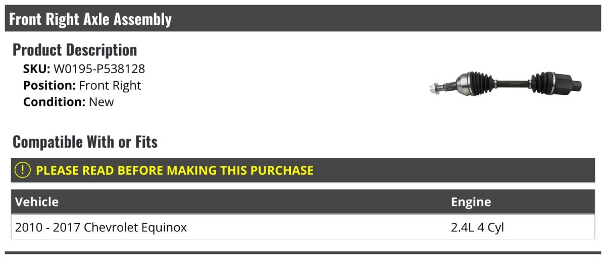 - Front Right Passenger Side Cv Axle Assembly For 2010-2017 Chevy Equinox 2 4l 4-cylinder