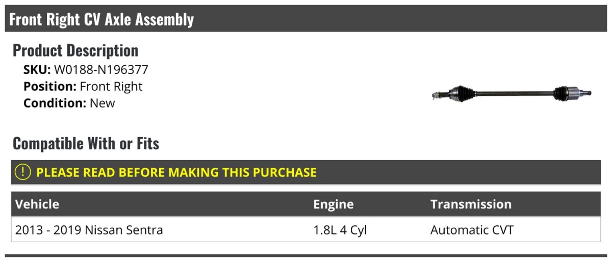 - Front Right Passenger Side Cv Axle Assembly For 2013-2019 Nissan Sentra 1 8l 4-cylinder With Automatic Transmission Cvt