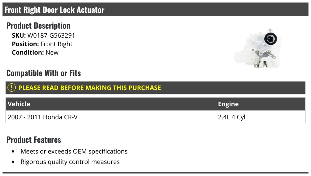 - Front Right Passenger Side Door Lock Actuator For 2007-2011 Honda Cr-v 2 4l 4-cylinder