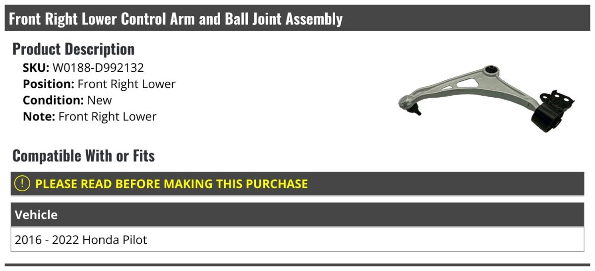 - Front Right Passenger Side Lower Control Arm And Ball Joint Assembly For 2016-2022 Honda Pilot