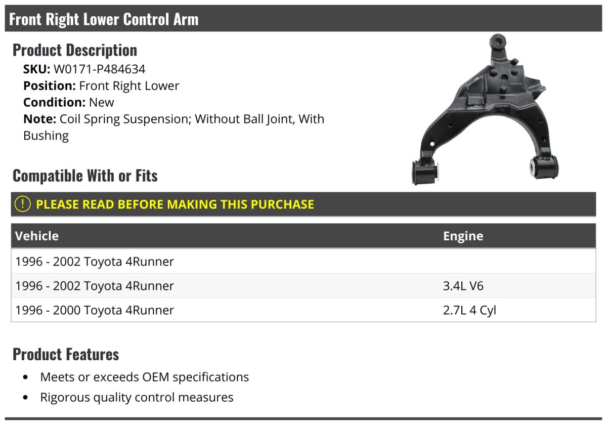 - Front Right Passenger Side Lower Control Arm With Bushing For 1996-2002 Toyota 4runner