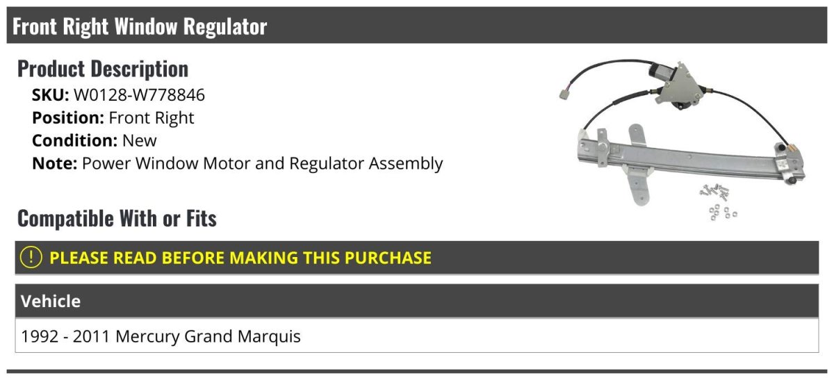 - Front Right Passenger Side Power Window Regulator And Motor Assembly For 1992-2011 Mercury Grand Marquis