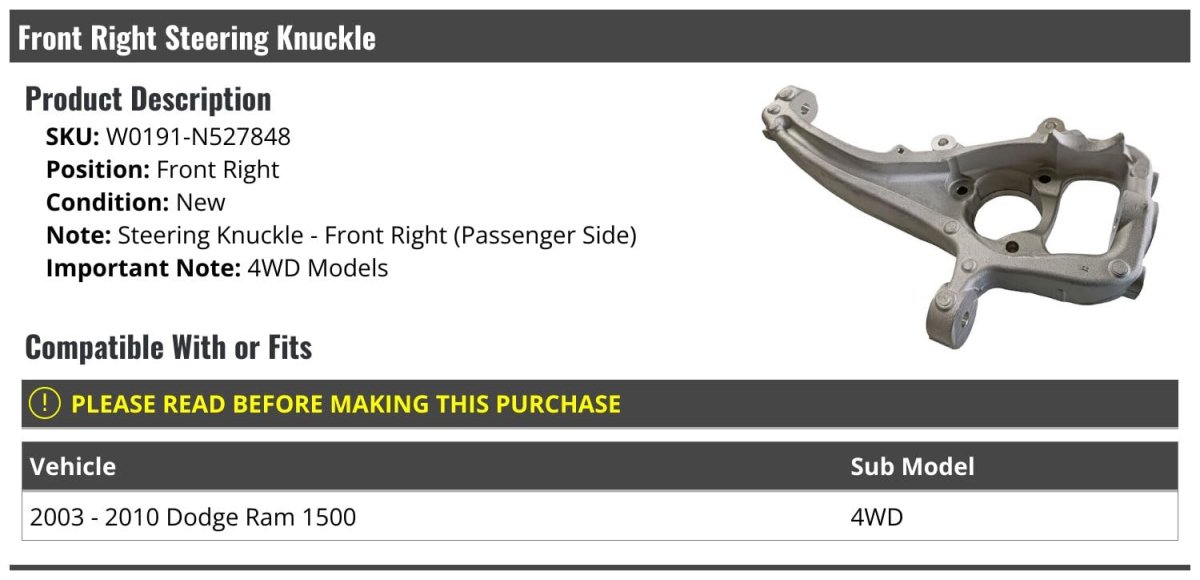 - Front Right Passenger Side Steering Knuckle For 2003-2010 Dodge Ram 1500 4wd