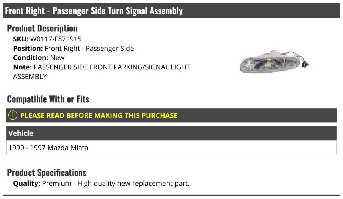 - Front Right Passenger Side Turn Signal Assembly For 1990-1997 Mazda Miata