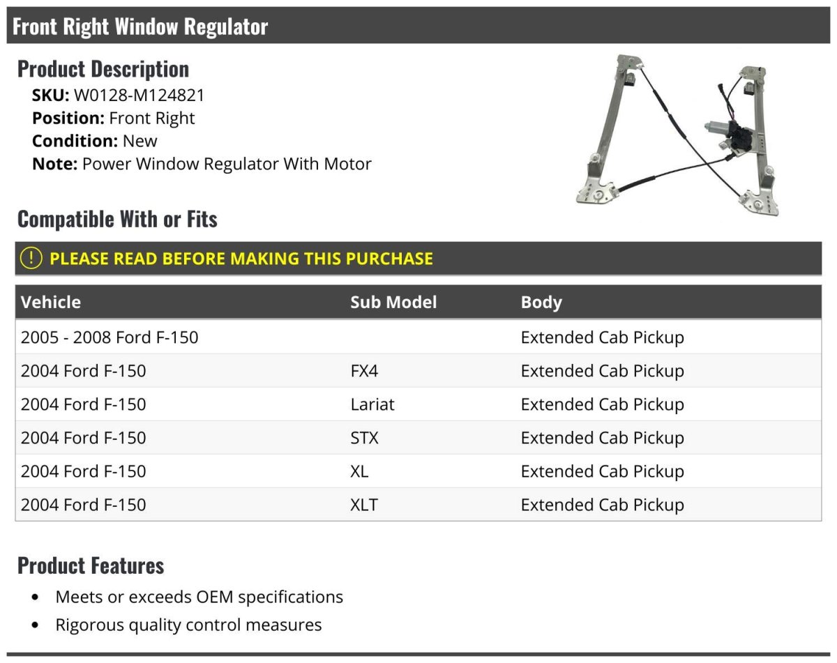 Power Window Regulator With Motor. Compatible with or fits: 2005 - 2008 Ford F-150 Extended Cab Pickup 2004 Ford F-150 FX4 Extended Cab Pickup 2004 Ford F-150 Lariat Extended Cab Pickup 2004 Ford F-150 STX Extended Cab Pickup 2004 Ford F-150 XL Extended Cab Pickup 2004 Ford F-150 XLT Extended Cab Pickup. Meets or exceeds OEM specifications. Rigorous quality control measures. Front Right Window Regulator.Other fine products