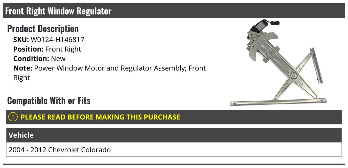 - Front Right Passenger Side Window Regulator With Motor For 2004-2012 Chevy Colorado