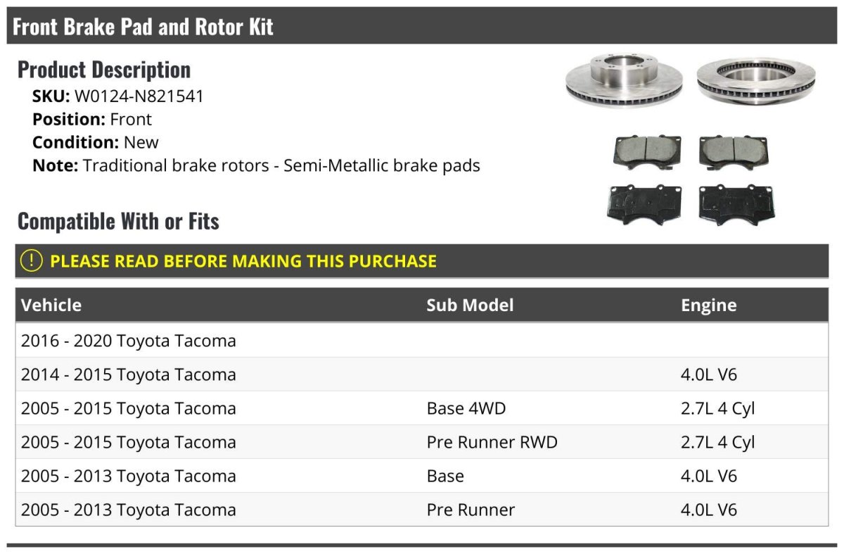 - Front Semi Metallic Brake Pads And Rotor Kit For 2005-2020 Toyota Tacoma