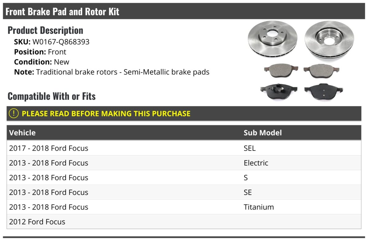 - Front Semi Metallic Brake Pads And Rotor Kit For 2012-2018 Ford Focus