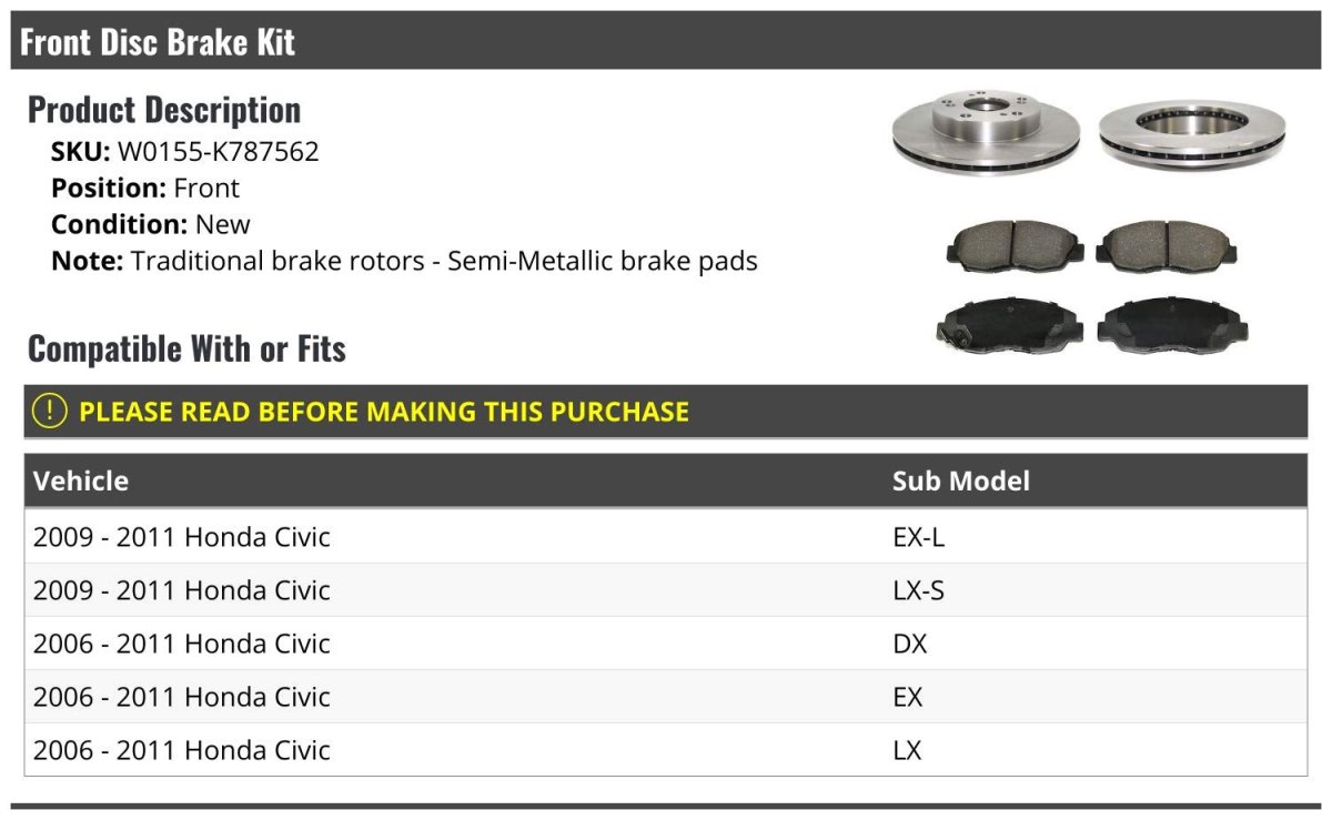 Traditional brake rotors - Semi-Metallic brake pads. Compatible with or fits: 2009 - 2011 Honda Civic EX-L 2009 - 2011 Honda Civic LX-S 2006 - 2011 Honda Civic DX 2006 - 2011 Honda Civic EX 2006 - 2011 Honda Civic LX. Front Disc Brake Kit. Review Description to Ensure Proper Fit.