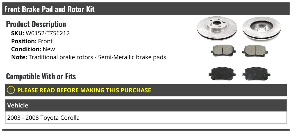 - Front Semi-metallic Brake Pad And Rotor Kit For 2003-2008 Toyota Corolla
