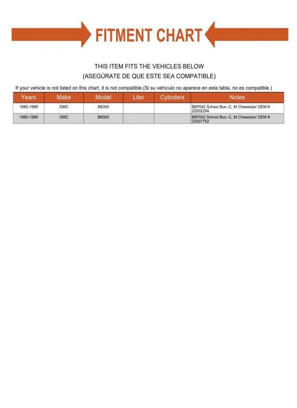 Fitment Notes: B6P042 School Bus -C, M Chassiswith OEM # 22002294with OEM # 22007752Position Location: Front. Designed with the latest software and manufactured with modern tooling. Direct fit replacement. Installs the same as factory unit. Same dimensions as OE part.Other fine products