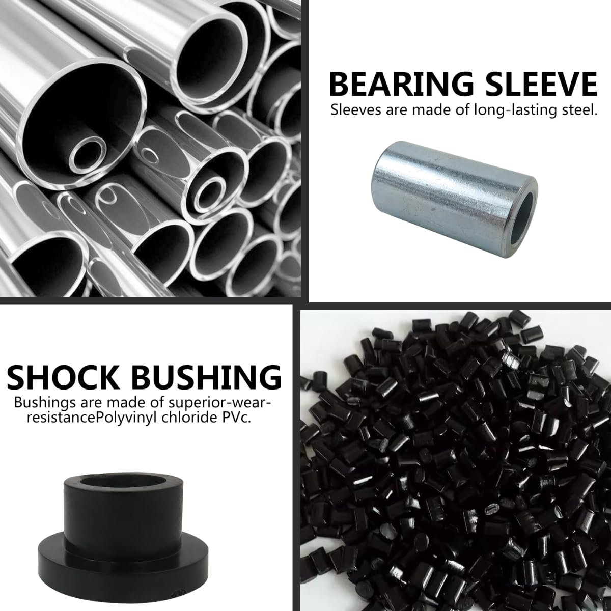 Fitment: for Polaris ATV/UTV;for Brutus 2013-2018;for PRO XD 2019-2023;for Ranger 1000 All Edition 2017;for Ranger 1000 Crew 2018;for Ranger 1000 Crew 2020-2023 Except Crew-XP;for NSTR, ;for High Lifter;for Premium Edition ;for Ranger 1000 Full Size 2020-2023;for Ranger 1000 Premium 2022-2023 Except XP Edition. Fitment: for Ranger 500 4x4 2009-2010 Except 2x4 Edition; for Ranger 570 Full-Size 2015-2016; for Ranger 700 4x4 2009 Except Crew, 6x6 Edition; for Ranger 800 2010-2017 Except Mid-Size Edition; for Ranger 900 2013-2019; for Ranger Diesel 1000/HST/Deluxe 2015-2018; for Ranger Diesel 900/HST/Deluxe 2011-2014. Material: This shock bushings is made by su-perior-wear-re-sis-tance P-olyvinyl ch-loride PV-C and the sleeves made by steel. Package Includes: Bushing Upper x 4, Bushing Lower x 4, Sleeve Upper x 2, Sleeve Lower x 2 as pictured.Other fine products