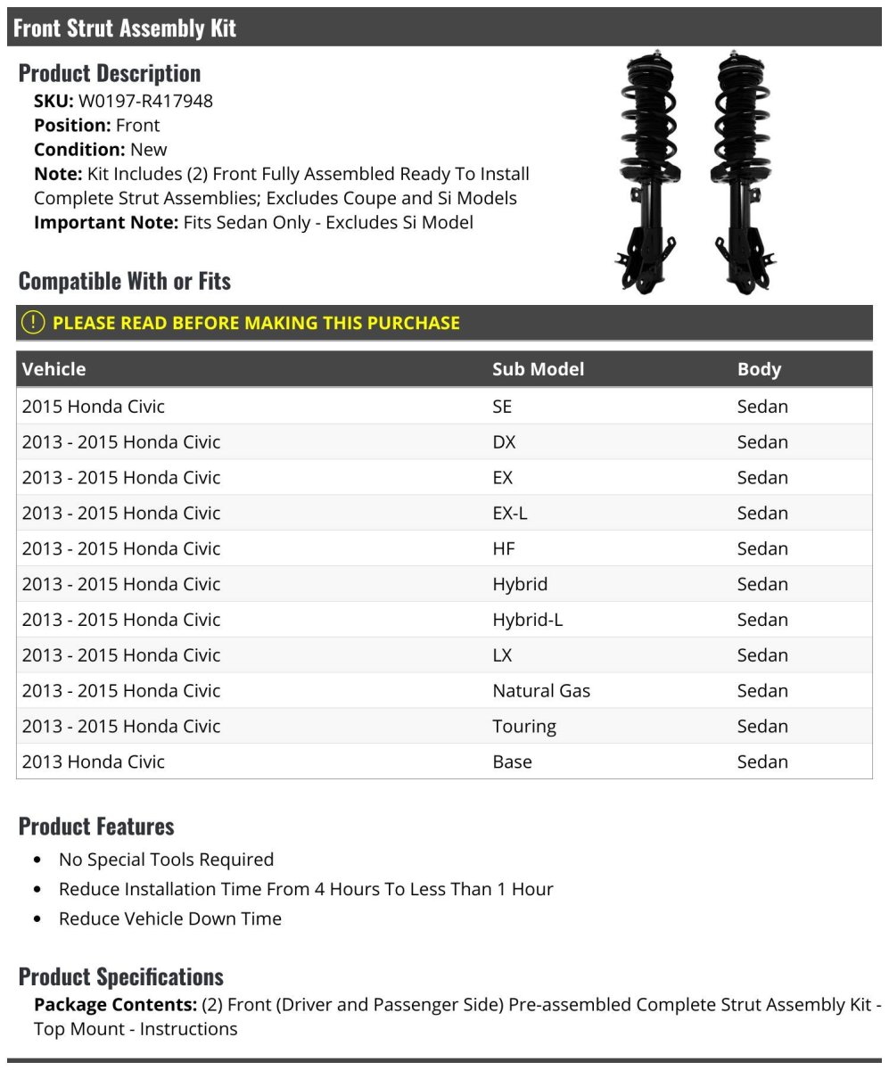 - Front Strut And Coil Spring Assembly 2 Piece Kit For 2013-2015 Honda Civic Sedan Excludes Coupe Si Models