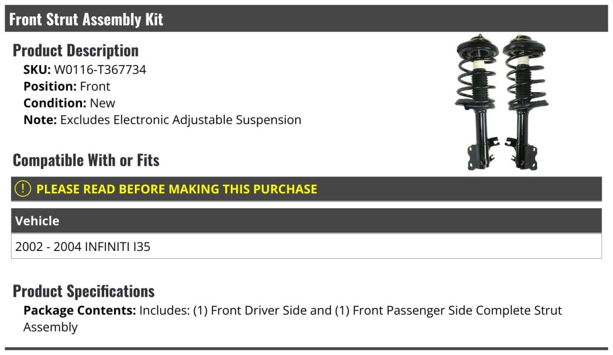 Compatible with or fits: 2002 - 2004 INFINITI I35. Package Contents: Includes: (1) Front Left Driver Side Strut and Coil Spring Assembly and (1) Front Right Passenger Side Strut and Coil Spring Assembly. Front Strut Assembly Kit. Review Description to Ensure Proper Fit. OE Quality.