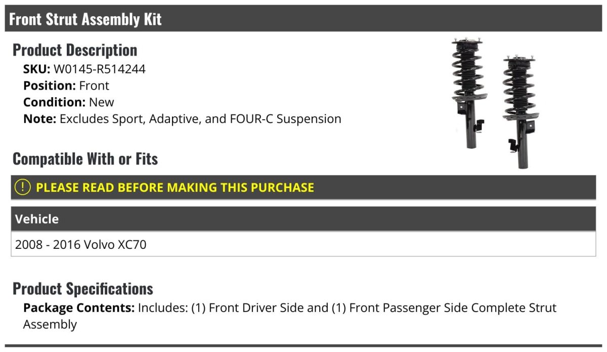 Compatible with or fits: 2008 - 2016 Volvo XC70. (Set of 2) Includes: (1) Front Left Driver Side Strut and Coil Spring Assembly and (1) Front Right Passenger Side Strut and Coil Spring Assembly. Front Strut and Coil Spring Assembly Kit. OE Quality. Review Description to Ensure Proper Fit.