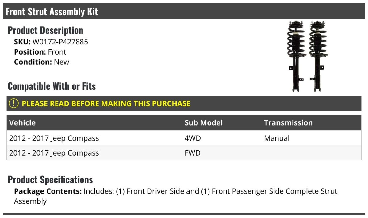 Compatible with or fits: 2012 - 2017 Jeep Compass 4WD Manual Transmission. Compatible with or fits: 2012 - 2017 Jeep Compass FWD. (Set of 2) Includes: (1) Front Left Driver Side Strut and Coil Spring Assembly (1) Front Right Passenger Side Strut and Coil Spring Assembly. Review Description to Ensure Proper Fit. OE Quality.Other fine products