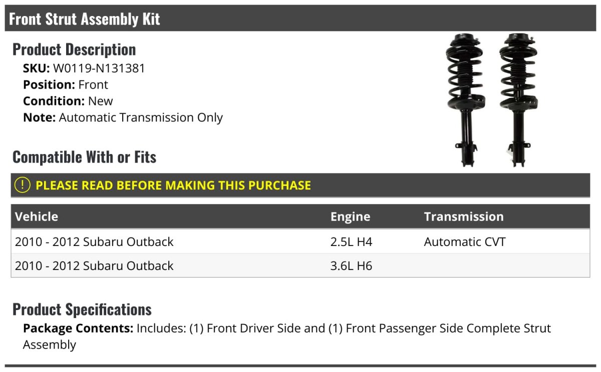 Compatible with or fits: 2010 - 2012 Subaru Outback 2.5L H4 Automatic CVT. Compatible with or fits: 2010 - 2012 Subaru Outback 3.6L H6. Automatic Transmission Only. Package Contents: Includes: (1) Front Driver Side and (1) Front Passenger Side Complete Strut Assembly. Review Description to Ensure Proper Fit.