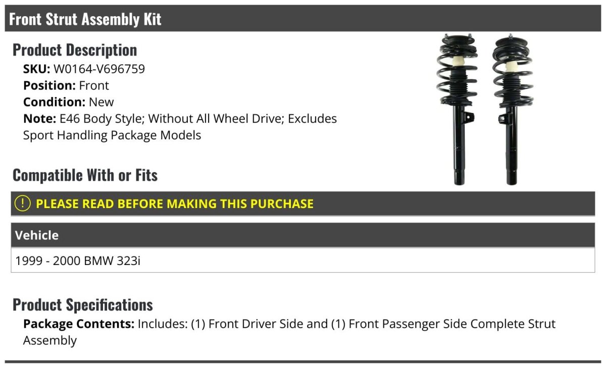 E46 Body Style; Without All Wheel Drive; Excludes Sport Handling Package Models. Compatible with or fits: 1999 - 2000 BMW 323i. (Set of 2) Includes: (1) Front Left Driver Side Strut and Coil Spring Assembly and (1) Front Right Passenger Side Strut and Coil Spring Assembly. Front Strut and Coil Spring Assembly. Review Description to Ensure Proper Fit.Other fine products