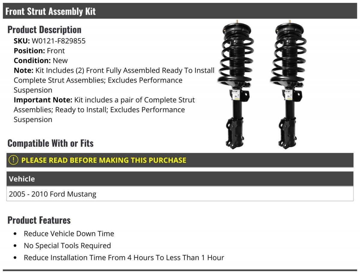 Kit Includes (2) Front Fully Assembled Ready To Install Complete Strut Assemblies; Excludes Performance Suspension. Kit includes a pair of Complete Strut Assemblies; Ready to Install; Excludes Performance Suspension. Compatible with or fits: 2005 - 2010 Ford Mustang. Reduce Vehicle Down Time No Special Tools Required Reduce Installation Time From 4 Hours To Less Than 1 Hour. Front Strut Assembly Kit.
