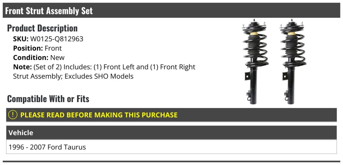 Compatible with or fits: 1996 - 2007 Ford Taurus. Includes: (1) Front Left Driver Side Strut and Coil Spring Assembly - (1) Front Right Passenger Side Strut and Coil Spring Assembly. (Set of 2) Front Strut and Coil Spring Assemblies. (Excludes SHO Models). OE Quality.
