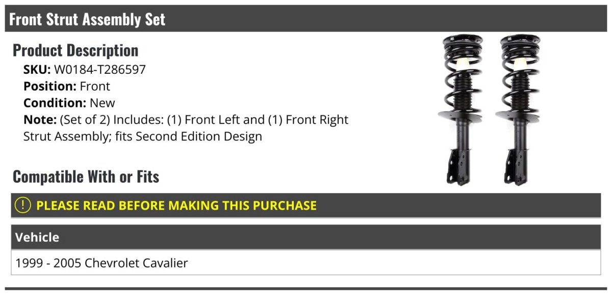 Compatible with or fits: 1999 - 2005 Chevy Cavalier. (Set of 2) Includes: (1) Front Left Driver Side Strut and Coil Spring Assembly and (1) Front Right Passenger Side Strut and Coil Spring Assembly. Position: Front. Review Description to Ensure Proper Fit. OE Quality.Other fine products