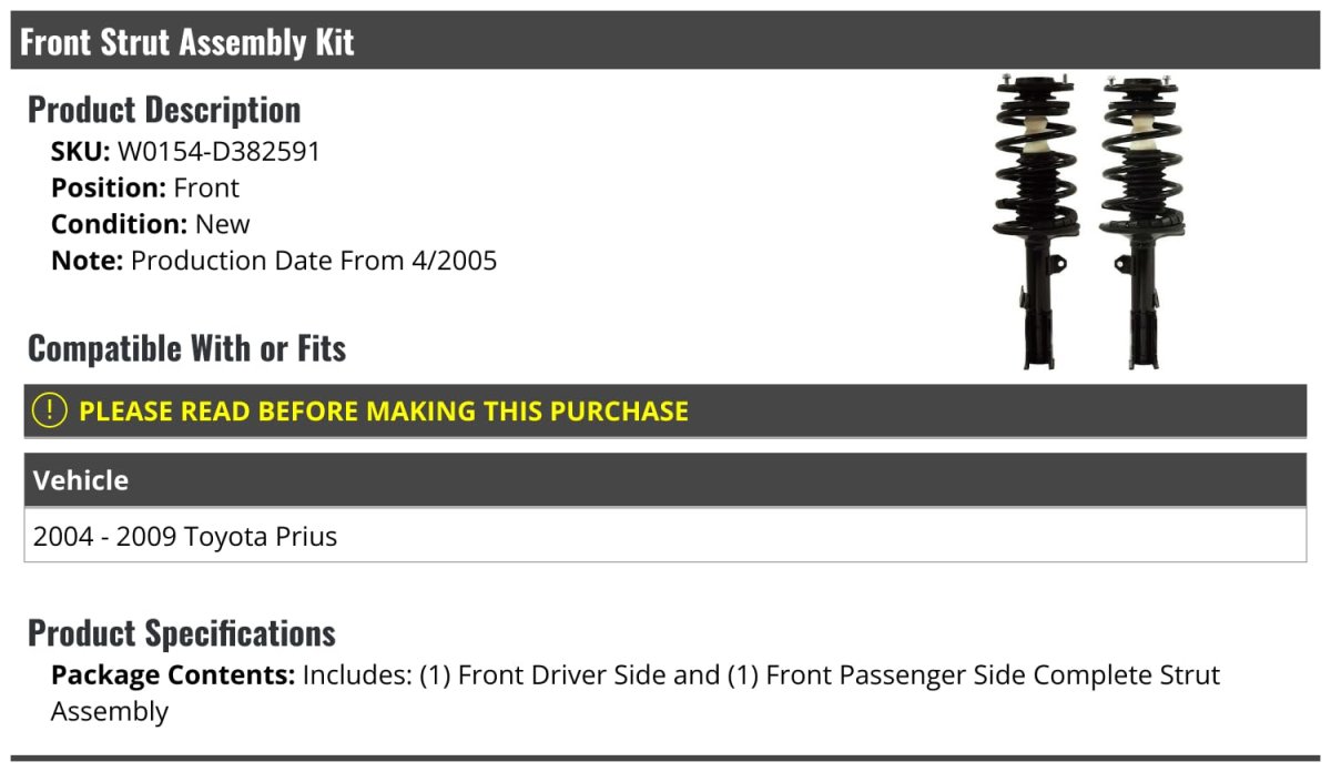 Production Date From 4/2005. Compatible with or fits: 2004 - 2009 Toyota Prius - Production Date From 4/2005. Package Contents: Includes: (1) Front Driver Side and (1) Front Passenger Side Complete Strut Assembly. Front Strut and Coil Spring Assembly Set. Review Description to Ensure Proper Fit.