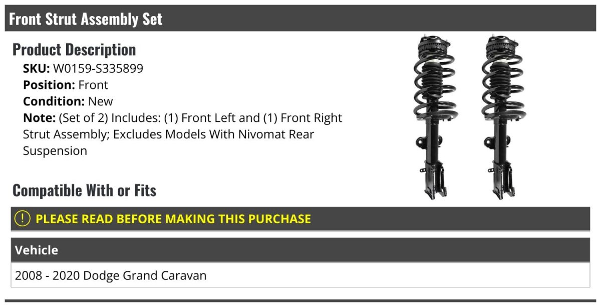 Compatible with or fits: 2008 - 2020 Dodge Grand Caravan. Includes: (1) Front Left Driver Side Strut and Coil Spring Assembly - (1) Front Right Passenger Side Strut and Coil Spring Assembly. (Set of 2) Front Strut and Coil Spring Assemblies. Review Description to Ensure Proper Fit. OE Quality.Other fine products