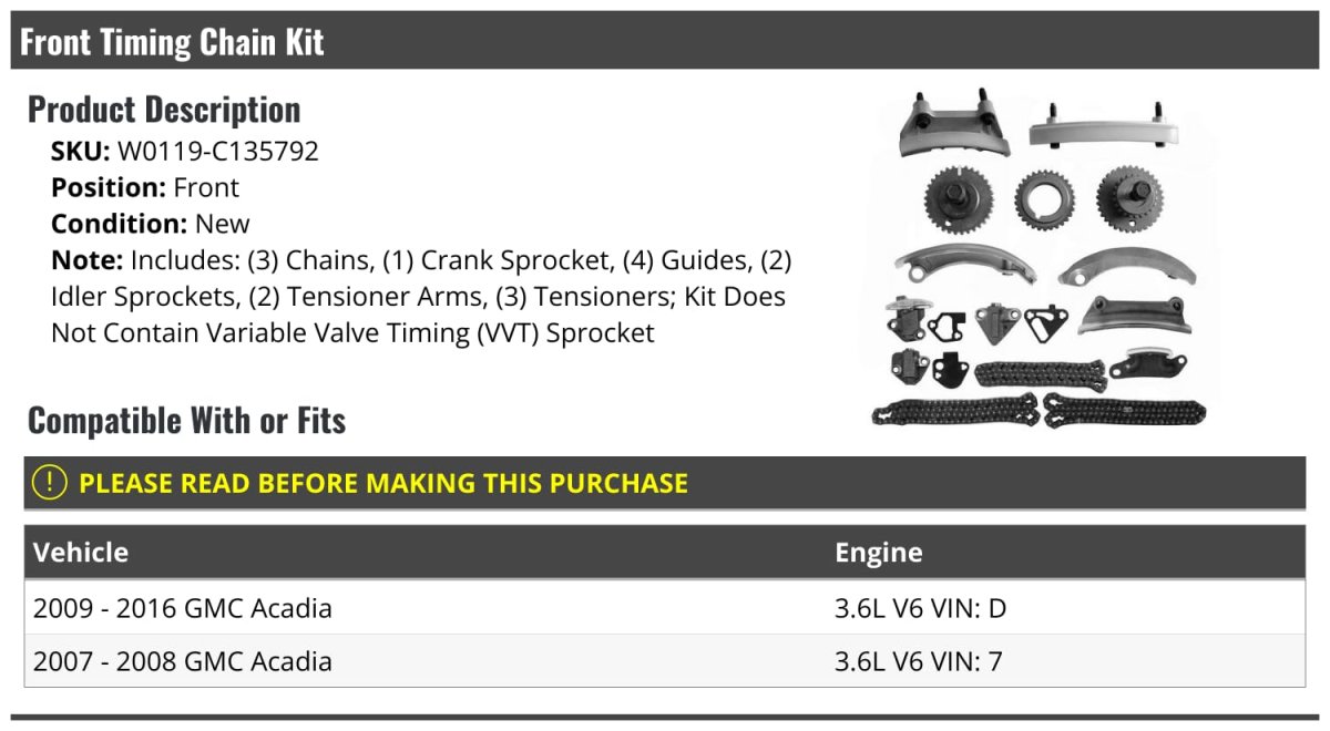 Includes: (3) Chains, (1) Crank Sprocket, (4) Guides, (2) Idler Sprockets, (2) Tensioner Arms, (3) Tensioners; Kit Does Not Contain Variable Valve Timing (VVT) Sprocket. Compatible with or fits: 2009 - 2016 GMC Acadia 3.6L V6 VIN: D. Compatible with or fits: 2007 - 2008 GMC Acadia 3.6L V6 VIN: 7. Review Description to Ensure Proper Fit. Front Timing Chain Kit.Other fine products