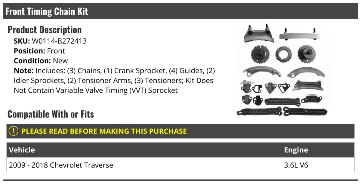 Includes: (3) Chains, (1) Crank Sprocket, (4) Guides, (2) Idler Sprockets, (2) Tensioner Arms, (3) Tensioners. Compatible with or fits: 2009 - 2018 Chevrolet Traverse 3.6L V6. Front Timing Chain Kit. Review Description to Ensure Proper Fit. Kit Does Not Contain Variable Valve Timing (VVT) Sprocket.Other fine products