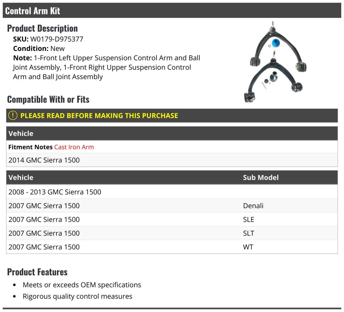 1-Front Left Upper Suspension Control Arm and Ball Joint Assembly, 1-Front Right Upper Suspension Control Arm and Ball Joint Assembly. Compatible with or fits: (Note: Cast Iron Arm; 2014 GMC Sierra 1500) (2008 - 2013 GMC Sierra 1500 2007 GMC Sierra 1500 Denali 2007 GMC Sierra 1500 SLE 2007 GMC Sierra 1500 SLT 2007 GMC Sierra 1500 WT). Meets or exceeds OEM specifications. Rigorous quality control measures. Control Arm Kit.Other fine products