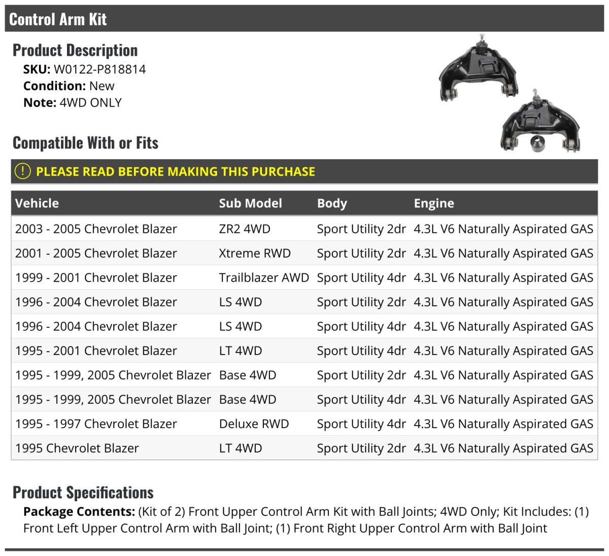 Compatible with or fits: 2003 - 2005 Chevy Blazer ZR2 4WD Sport Utility 2dr 4.3L V6 Naturally Aspirated GAS 2001 - 2005 Chevy Blazer Xtreme RWD Sport Utility 2dr 4.3L V6 Naturally Aspirated GAS 1999 - 2001 Chevy Blazer Trailblazer AWD Sport Utility 4dr 4.3L V6 Naturally Aspirated GAS. Compatible with or fits: 1996 - 2004 Chevy Blazer LS 4WD Sport Utility 2dr 4.3L V6 Naturally Aspirated GAS 1996 - 2004 Chevy Blazer LS 4WD Sport Utility 4dr 4.3L V6 Naturally Aspirated GAS 1995 - 2001 Chevy Blazer LT 4WD Sport Utility 4dr 4.3L V6 Naturally Aspirated GAS. Compatible with or fits: 1995 - 1999, 2005 Chevy Blazer Base 4WD Sport Utility 2dr 4.3L V6 Naturally Aspirated GAS 1995 - 1999, 2005 Chevy Blazer Base 4WD Sport Utility 4dr 4.3L V6 Naturally Aspirated GAS. Compatible with or fits: 1995 - 1997 Chevy Blazer Deluxe RWD Sport Utility 4dr 4.3L V6 Naturally Aspirated GAS 1995 Chevy Blazer LT 4WD Sport Utility 2dr 4.3L V6 Naturally Aspirated GAS. Package Contents: (Kit of 2) Front Upper Control Arm Kit with Ball Joints; 4WD Only.Other fine products