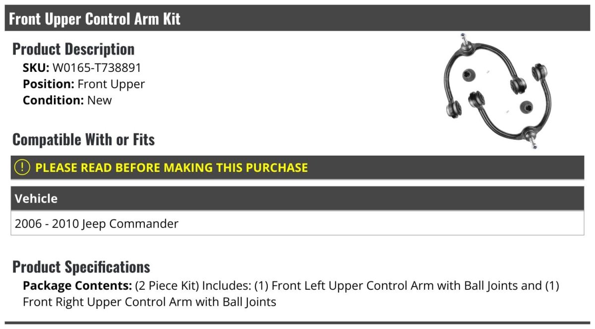 Compatible with or fits: 2006 - 2010 Jeep Commander. Package Contents: (2 Piece Kit) Includes: (1) Front Left Driver Side Upper Control Arm with Ball Joint and (1) Front Right Passenger Side Upper Control Arm with Ball Joint. Position: Front Upper. Review Description to Ensure Proper Fit. OE Quality.Other fine products