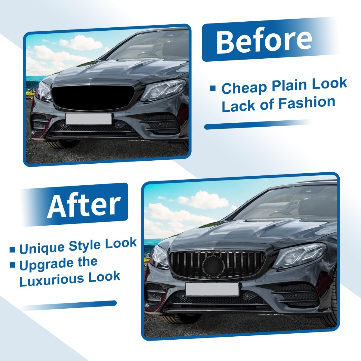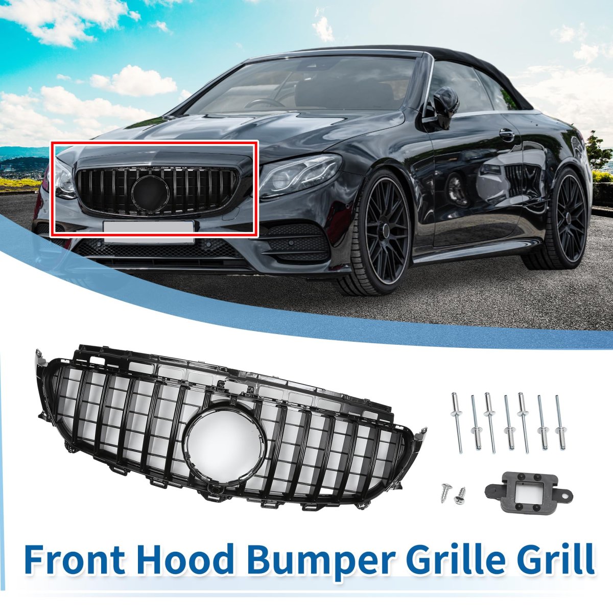 Fitment: The front hood bumper grille is fit for Mercedes-Benz E200 2016-2020, for Mercedes-Benz E250 2016-2019, for Mercedes-Benz E300 2016-2020, for Mercedes-Benz E350 2016, for Mercedes-Benz E350 2020, for Mercedes-Benz E400 2016-2018, for Mercedes-Benz E450 2019-2020, for Mercedes-Benz E500 2016-2017, for Mercedes-Benz E550 2016-2017. Features: Front hood grille grill can directly replace old or worn car grilles. Improving your car grade, upgrade your vehicle's exterior styling for a luxurious look that will make your car unique.. Advantage: The front bumper grille grill is made in Durable ABS plastic which makes it light and stable. Overall durable construction can withstand heat generated by engine and sun exposure. This material is resistant to corrosion, fading, and impact, ensuring your grille will look great for years to come.. Function: The gap after installation is small. The hood bumper grill provides better airflow to the radiator to help the cooling process better. Will not affect the shutters behind the car grille..Other fine products