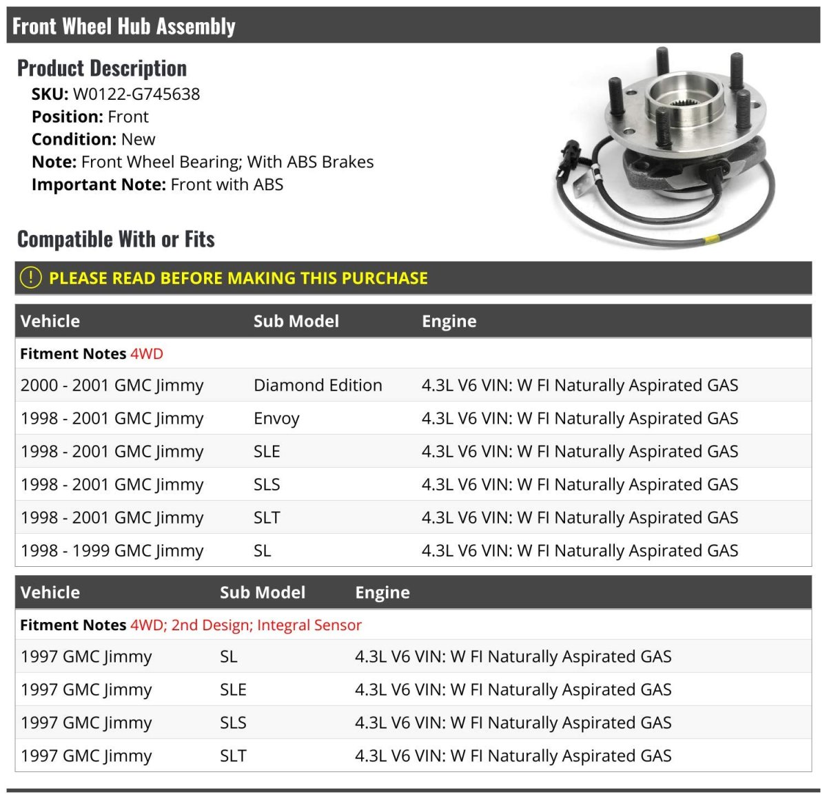 Front Wheel Bearing; With ABS Brakes. Front with ABS. Compatible with or fits: Note: 4WD; 2000 - 2001 GMC Jimmy Diamond Edition 4.3L V6 VIN: W FI Naturally Aspirated GAS 1998 - 2001 GMC Jimmy Envoy 4.3L V6 VIN: W FI Naturally Aspirated GAS 1998 - 2001 GMC Jimmy SLE 4.3L V6 VIN: W FI Naturally Aspirated GAS 1998 - 2001 GMC Jimmy SLS 4.3L V6 VIN: W FI Naturally Aspirated GAS 1998 - 2001 GMC Jimmy SLT 4.3L V6 VIN: W FI Naturally Aspirated GAS 1998 - 1999 GMC Jimmy SL 4.3L V6 VIN: W FI Naturally Aspirated GAS. Compatible with or fits: Note: 4WD; 2nd Design; Integral Sensor; 1997 GMC Jimmy SL 4.3L V6 VIN: W FI Naturally Aspirated GAS 1997 GMC Jimmy SLE 4.3L V6 VIN: W FI Naturally Aspirated GAS 1997 GMC Jimmy SLS 4.3L V6 VIN: W FI Naturally Aspirated GAS 1997 GMC Jimmy SLT 4.3L V6 VIN: W FI Naturally Aspirated GAS. Front Wheel Hub Assembly.Other fine products