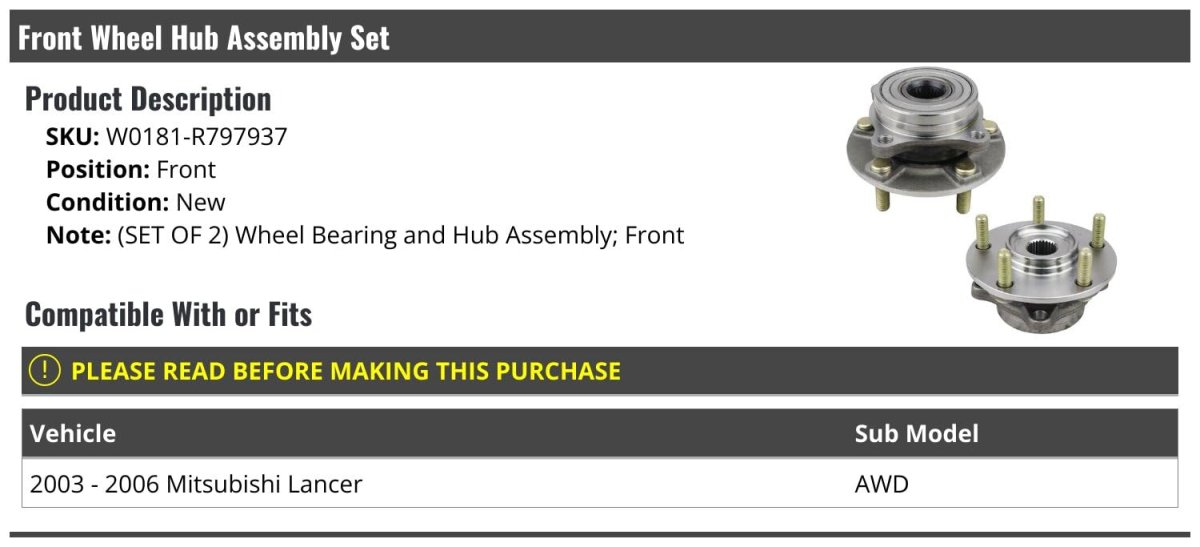 - Front Wheel Bearing Hub Assembly Set Of 2 For 2003-2006 Mitsubishi Lancer Awd