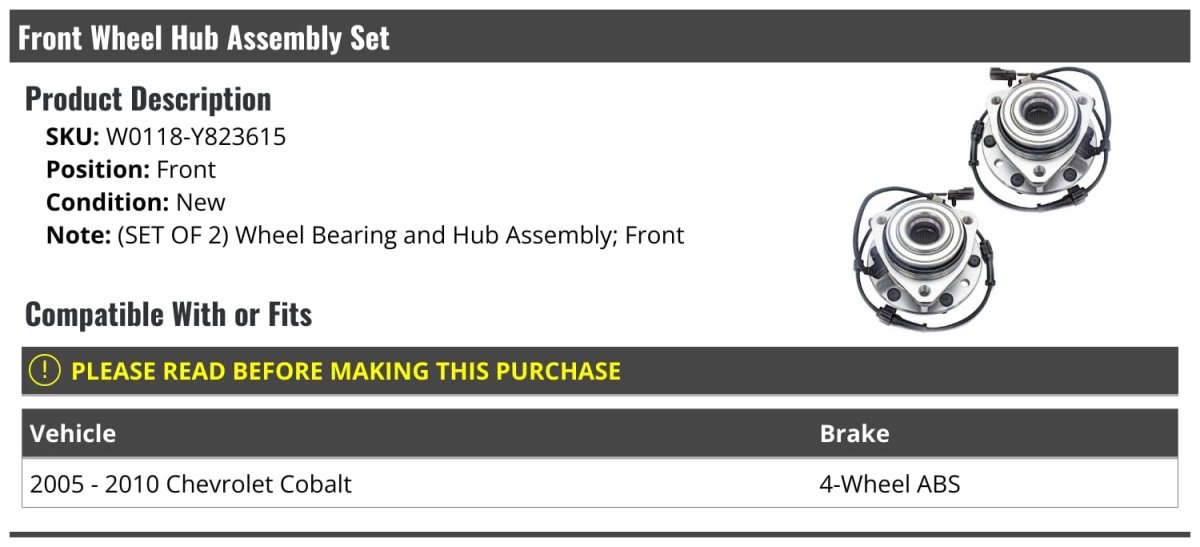 - Front Wheel Bearing Hub Assembly Set Of 2 For 2005-2010 Chevy Cobalt With 4-wheel Abs