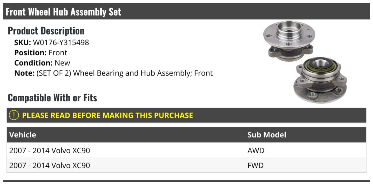 - Front Wheel Bearing Hub Assembly Set Of 2 For 2007-2014 Volvo Xc90