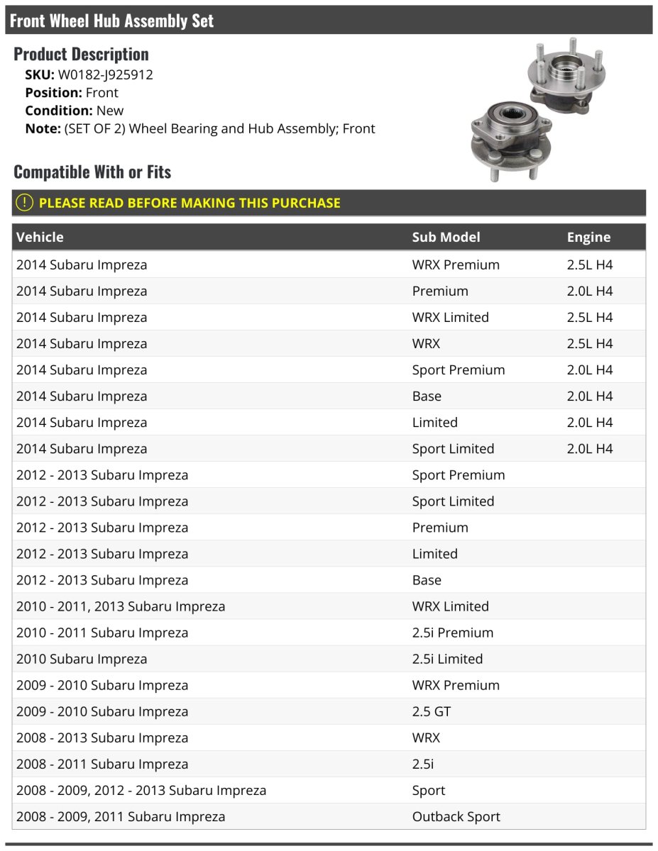 Compatible with or fits: 2014 Subaru Impreza WRX Premium 2.5L H4 2014 Subaru Impreza Premium 2.0L H4 2014 Subaru Impreza WRX Limited 2.5L H4 2014 Subaru Impreza WRX 2.5L H4 2014 Subaru Impreza Sport Premium 2.0L H4. Compatible with or fits: 2014 Subaru Impreza Base 2.0L H4 2014 Subaru Impreza Limited 2.0L H4 2014 Subaru Impreza Sport Limited 2.0L H4 2012 - 2013 Subaru Impreza Sport Premium 2012 - 2013 Subaru Impreza Sport Limited. Compatible with or fits: 2012 - 2013 Subaru Impreza Premium 2012 - 2013 Subaru Impreza Limited 2012 - 2013 Subaru Impreza Base 2010 - 2011, 2013 Subaru Impreza WRX Limited 2010 - 2011 Subaru Impreza 2.5i Premium. Compatible with or fits: 2010 Subaru Impreza 2.5i Limited 2009 - 2010 Subaru Impreza WRX Premium 2009 - 2010 Subaru Impreza 2.5 GT 2008 - 2013 Subaru Impreza WRX. Compatible with or fits: 2008 - 2011 Subaru Impreza 2.5i 2008 - 2009, 2012 - 2013 Subaru Impreza Sport 2008 - 2009, 2011 Subaru Impreza Outback Sport.Other fine products