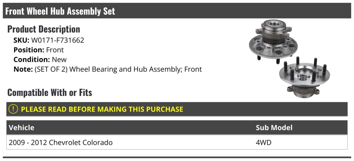 - Front Wheel Bearing Hub Assembly Set Of 2 For 2009-2012 Chevy Colorado 4wd