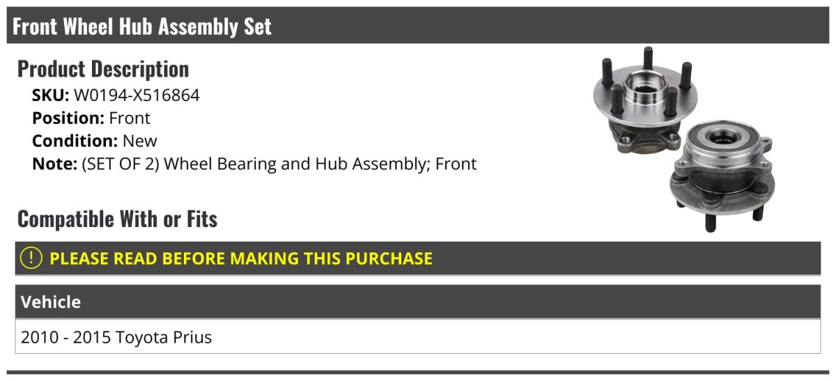 - Front Wheel Bearing Hub Assembly Set Of 2 For 2010-2015 Toyota Prius