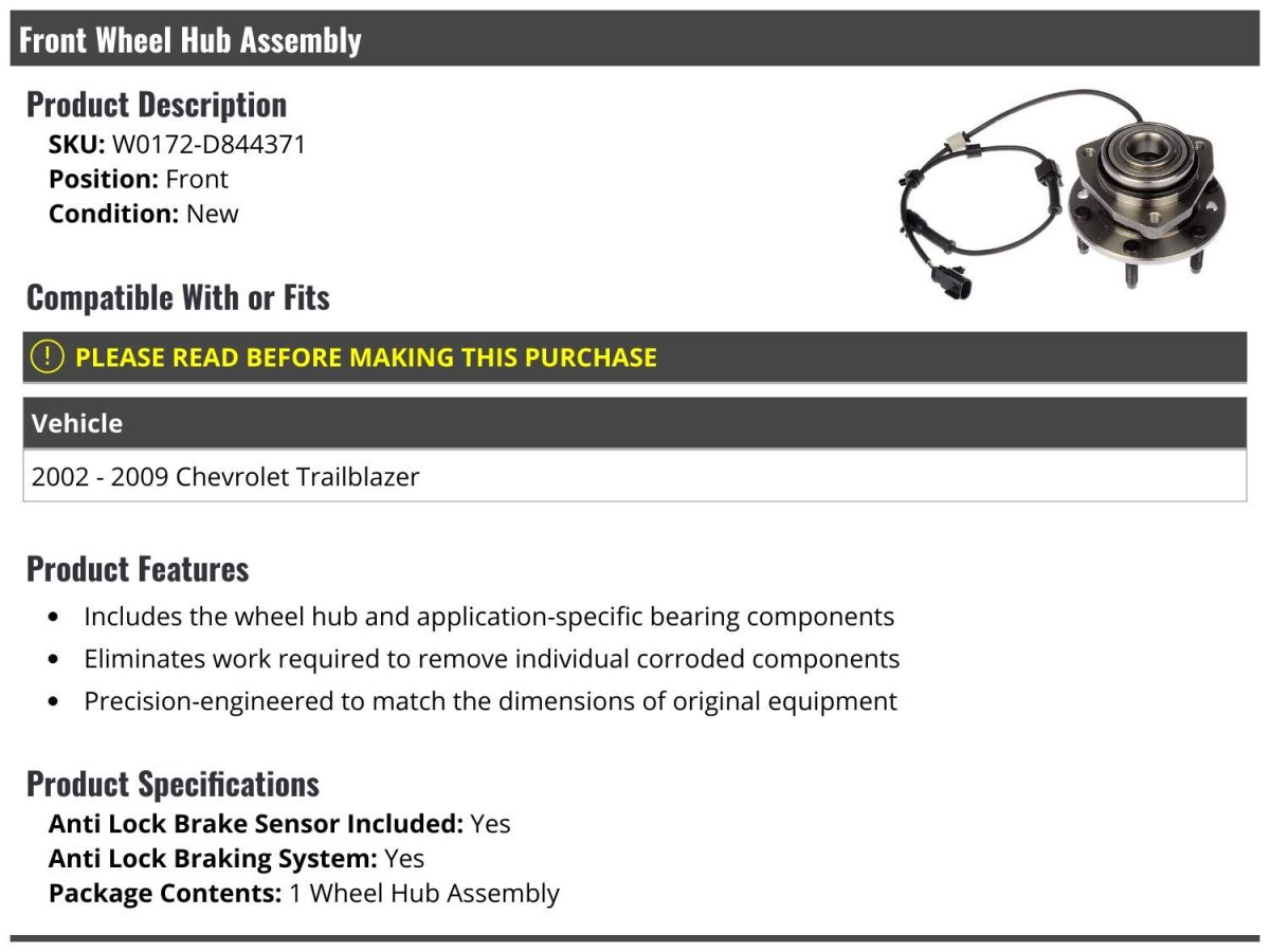 Compatible with or fits: 2002 - 2009 Chevy Trailblazer. Includes the wheel hub and application-specific bearing components. Eliminates work required to remove individual corroded components. Precision-engineered to match the dimensions of original equipment. Anti Lock Brake Sensor Included: Yes; Anti Lock Braking System: Yes; Package Contents: 1 Wheel Hub Assembly.Other fine products